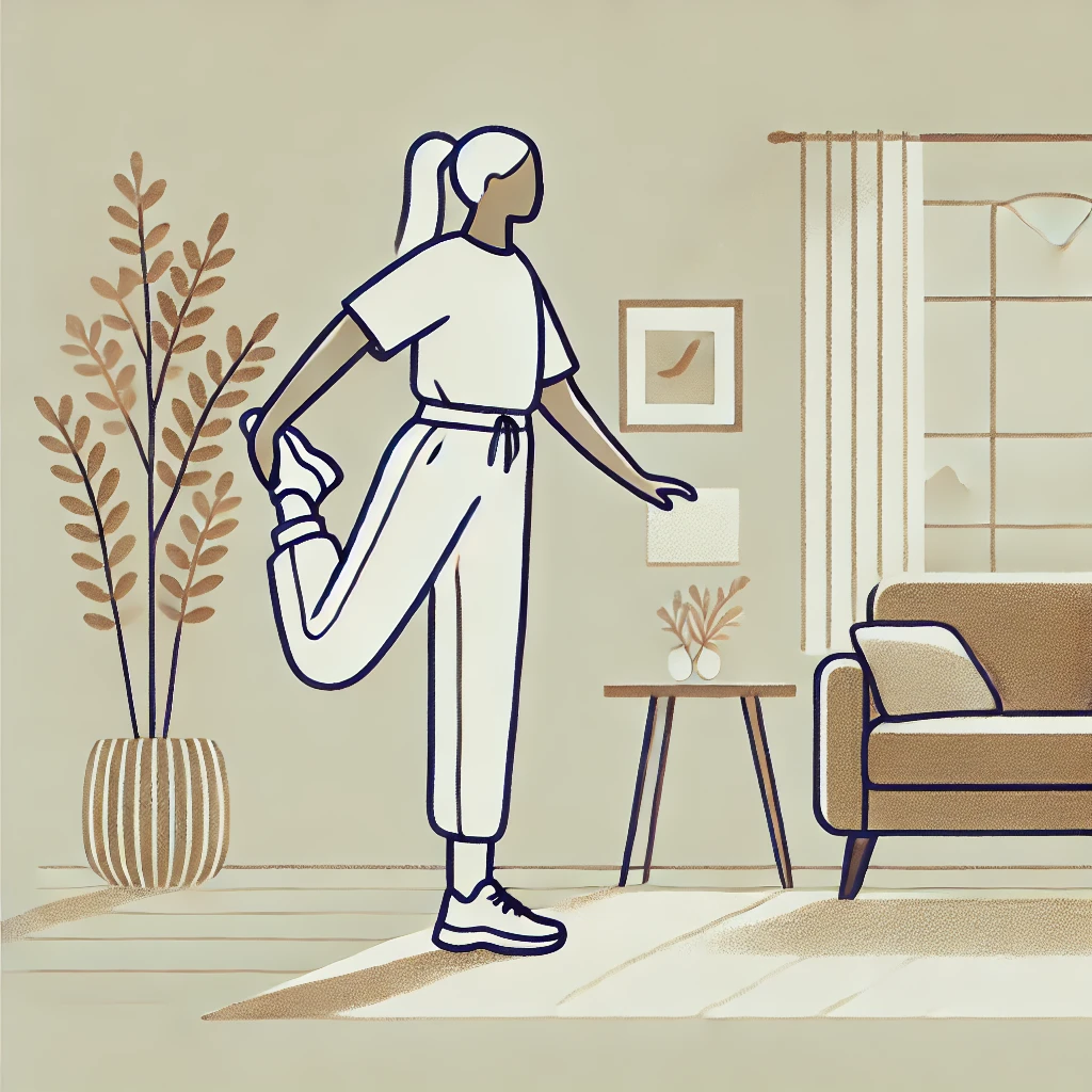 DALL·E 2024-07-01 15.54.51 – An illustration of a woman doing a quadriceps stretch. The woman is standing on one leg, holding the other leg’s ankle behind her with one hand, pulli