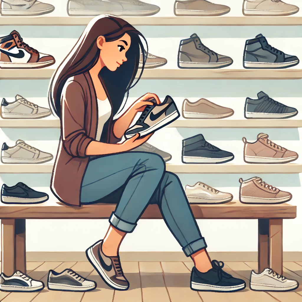 DALL·E 2024-07-01 16.00.10 – An illustration of a woman choosing appropriate sneakers. The woman is sitting on a bench, trying on different pairs of sneakers. She is holding one s