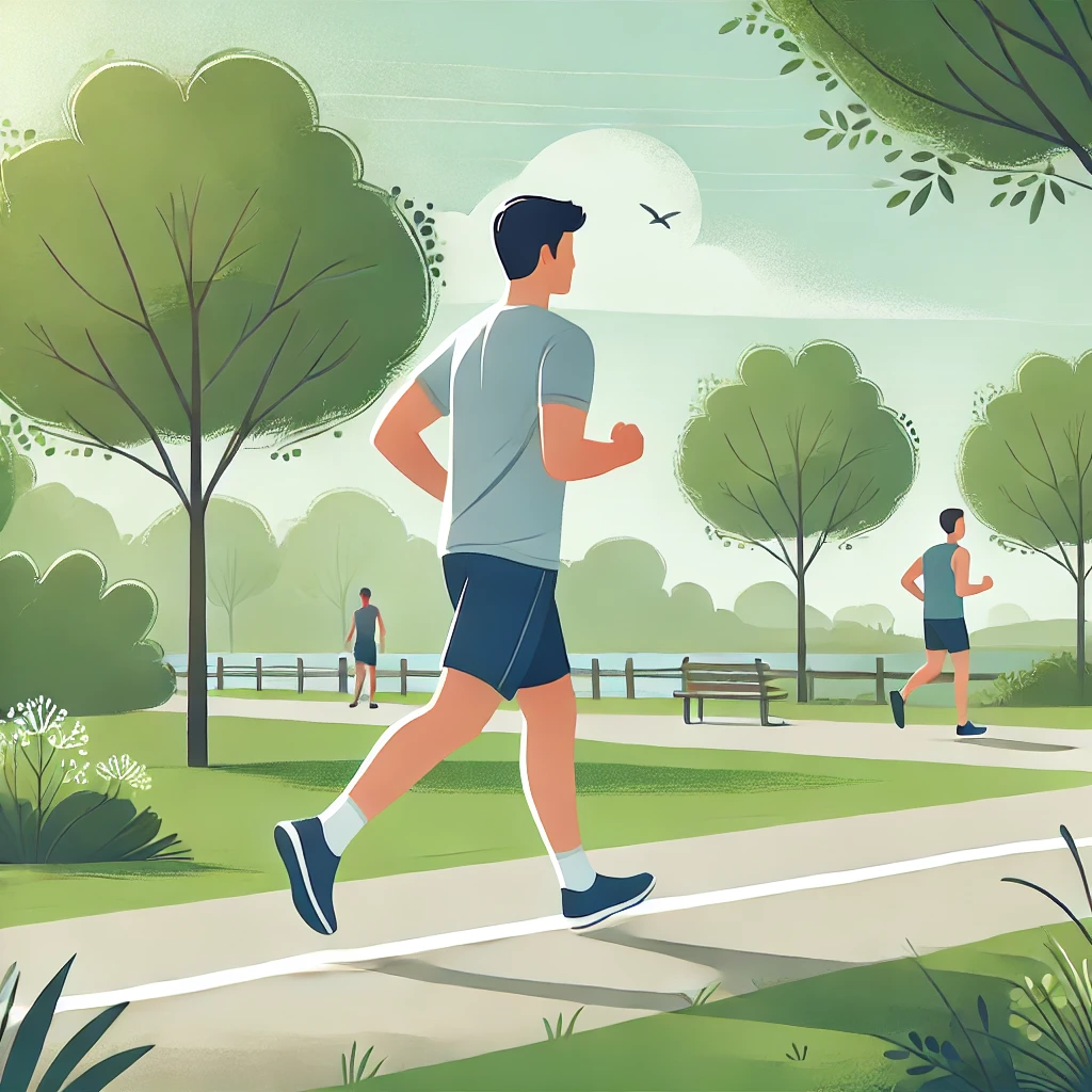 DALL·E 2024-07-01 16.00.41 – An illustration of a person engaging in moderate exercise. The person is jogging in a park, wearing comfortable sports attire like a t-shirt, shorts, - 倉敷市藤戸町の完全予約制整骨院〝天城整骨院〟です。