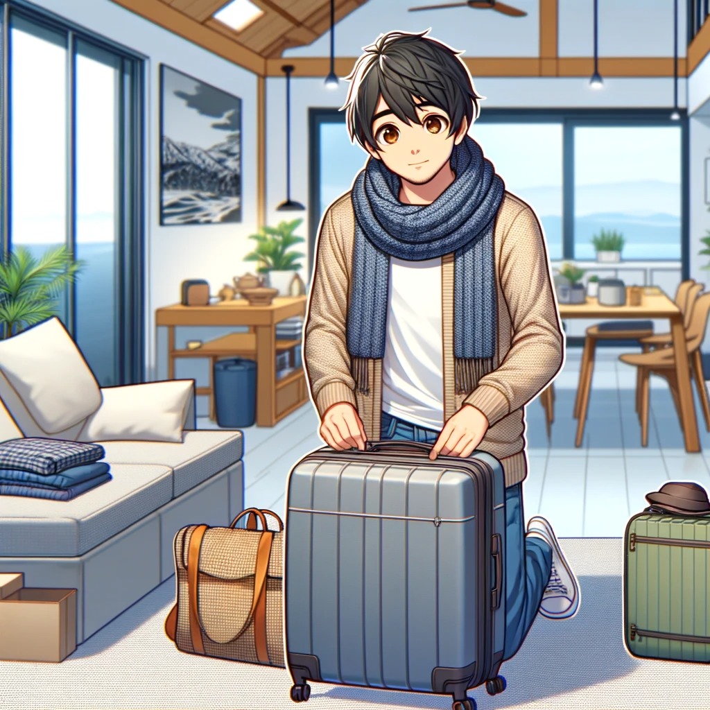 トップページ>肩こり>年末年始の旅行計画、長時間の移動での体の痛み対策>DALL·E 2023-11-24 08.46.48 – Deformation anime style illustration of a middle-aged Asian man in casual winter clothes preparing for a holiday trip at home. He is packing a suitcas