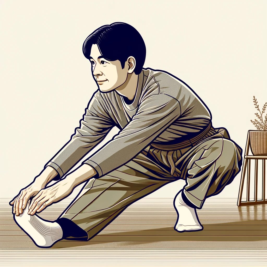 DALL·E 2023-12-07 17.29.10 – An illustration of an Asian person in their 40s to 60s doing a morning stretch routine in a modern Japanese-Western mixed style living room. They are - 倉敷市藤戸町の完全予約制整骨院〝天城整骨院〟です。