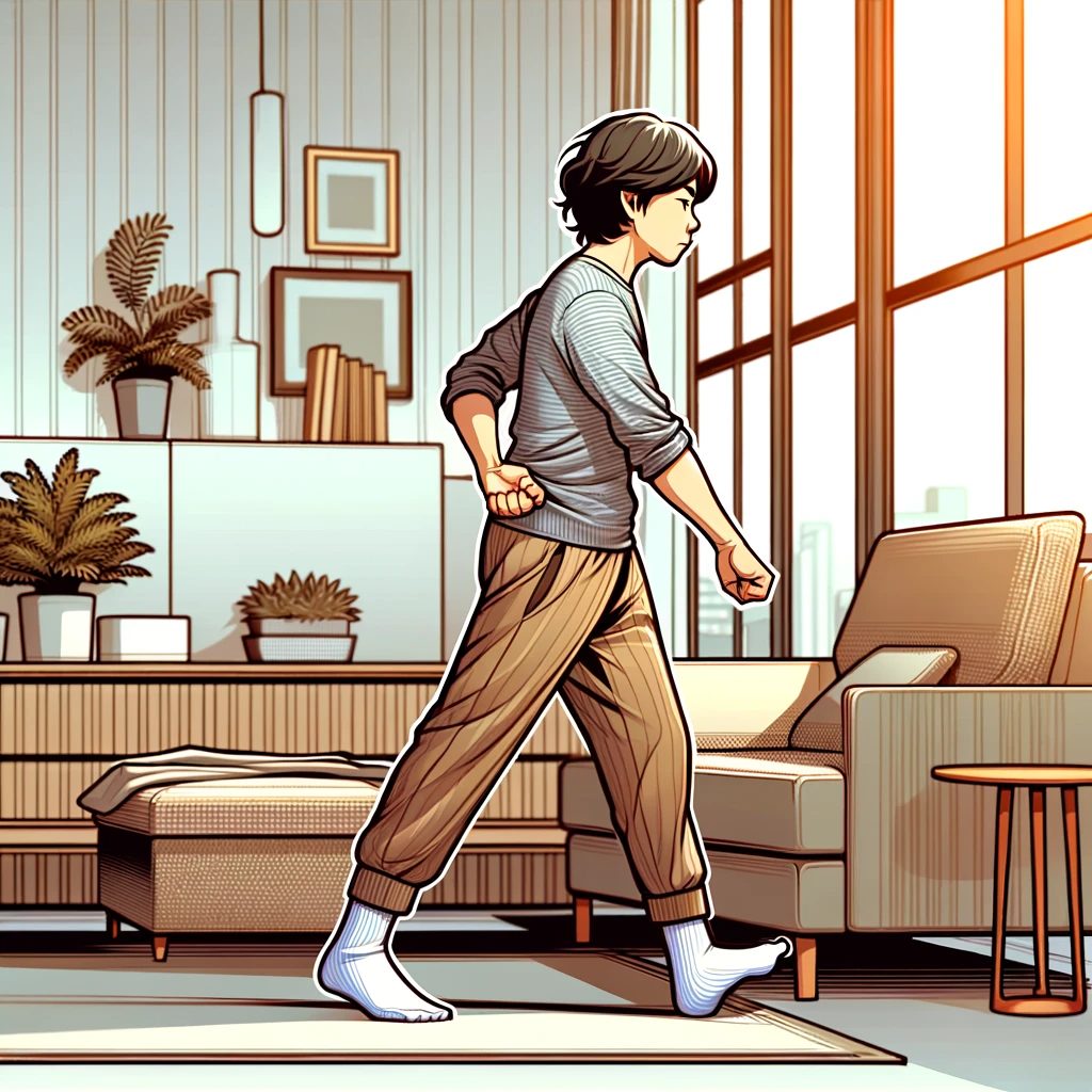 トップページ>腰痛>寒い季節に室内でできる効果的な腰痛を予防するエクササイズ>DALL·E 2023-12-07 17.41.31 – Illustration of an Asian individual in their 40s to 60s in a contemporary room, showcasing a mix of Japanese and Western styles. They are doing a quic