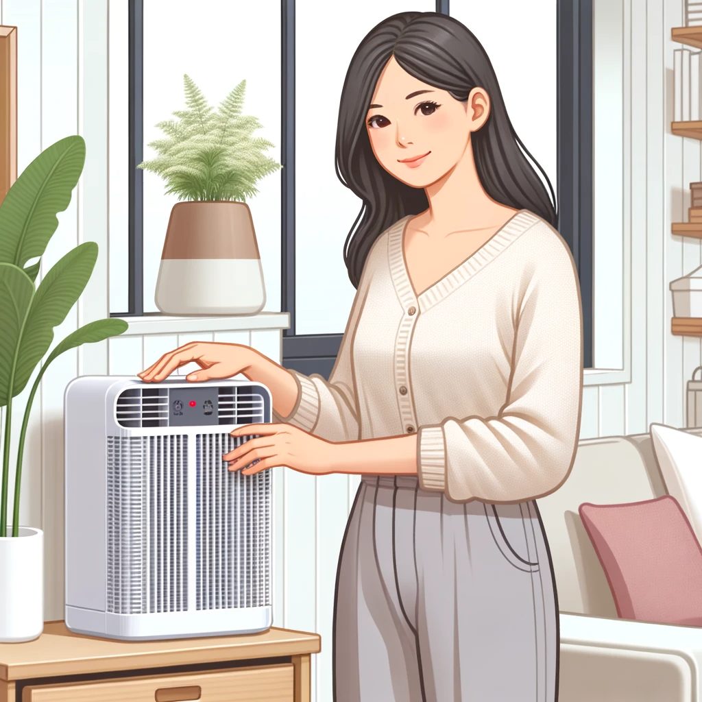 DALL·E 2024-01-17 12.28.08 – Illustration of a middle-aged Asian woman adjusting an air purifier in her home to enhance the indoor environment for allergy prevention. The room is - 倉敷市藤戸町の完全予約制整骨院〝天城整骨院〟です。