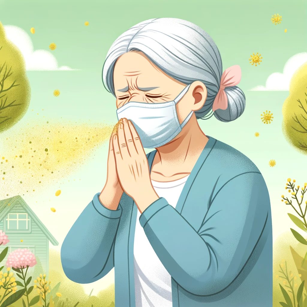 DALL·E 2024-01-17 12.45.50 – Illustration of an elderly woman wearing a mask outdoors, experiencing a sneeze due to hay fever in a setting where pollen is visibly dispersing in th - 倉敷市藤戸町の完全予約制整骨院〝天城整骨院〟です。
