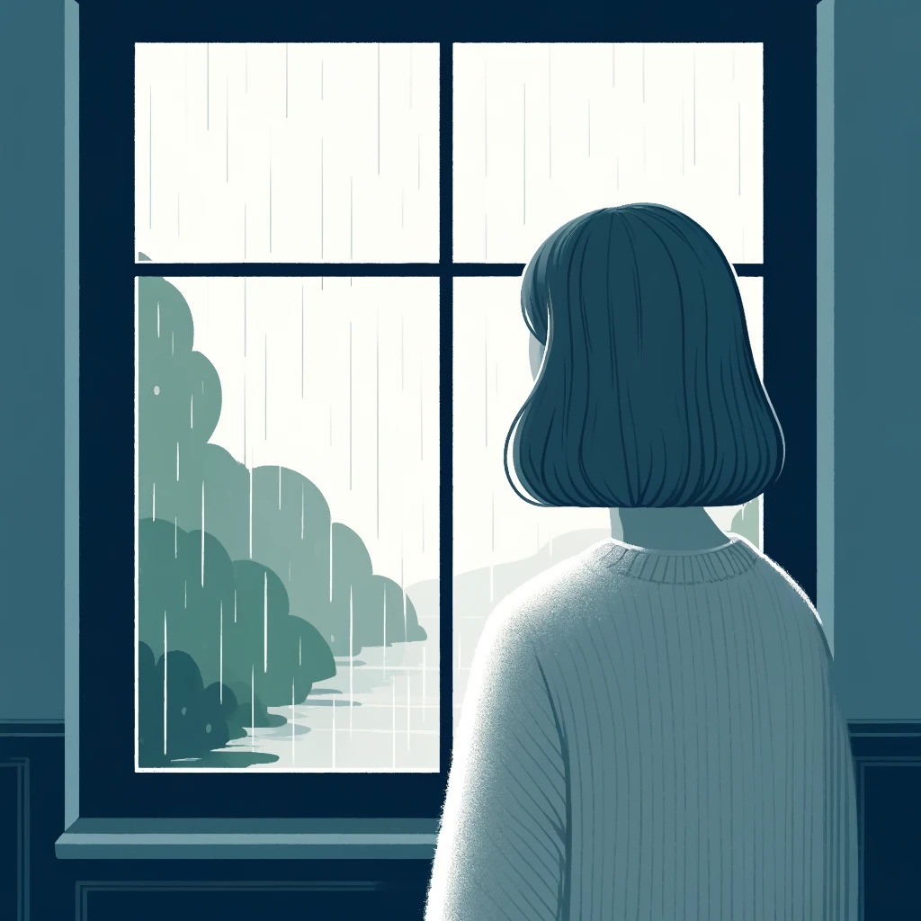 DALL·E 2024-05-14 17.56.16 – A simple illustration showing a woman looking at the rain through a window. The window frame is prominent, with raindrops streaming down the glass. Th