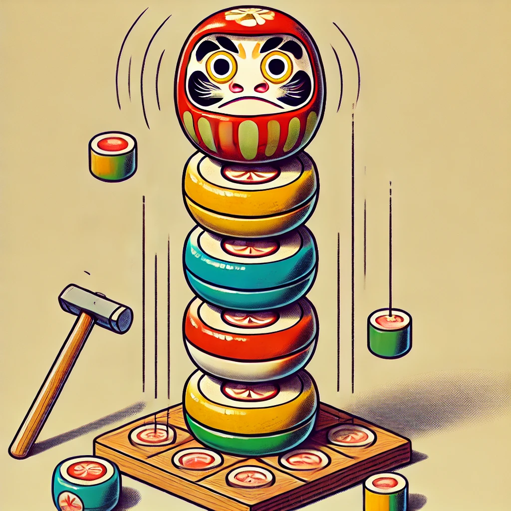 DALL·E 2024-06-20 05.26.07 – An illustration of a traditional Japanese Daruma Otoshi game that is about to topple. The game features a stack of five colorful wooden cylinders arra