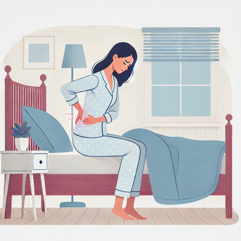 DALL·E 2024-07-26 11.59.38 – A simple, clean, and flat illustration style of a woman around 40 years old. She is sitting on the edge of a bed, experiencing lower back pain. The sc