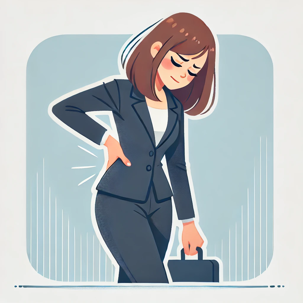 DALL·E 2024-08-23 10.19.08 – A simple, clean, and flat style illustration of a woman walking and experiencing lower back pain. The woman is holding her lower back with one hand, a - 倉敷市藤戸町の完全予約制整骨院〝天城整骨院〟です。
