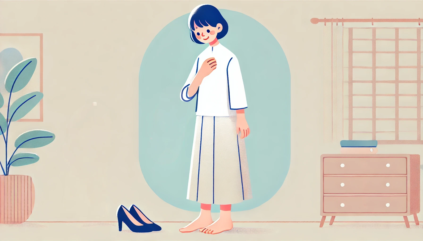DALL·E 2024-08-21 11.49.01 – A healthy and friendly illustration of a middle-aged Japanese woman standing barefoot in a simple room. She is holding a pair of high heels in one han - 倉敷市藤戸町の完全予約制整骨院〝天城整骨院〟です。