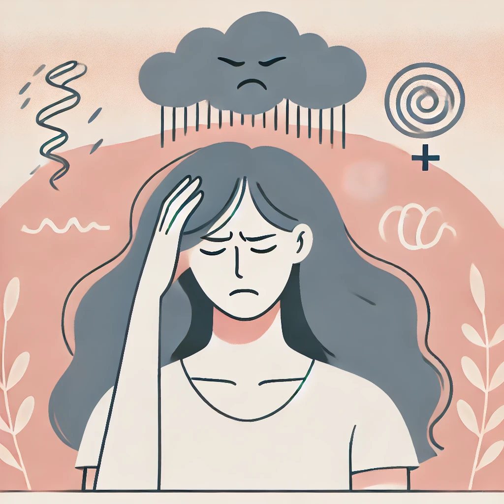 DALL·E 2024-08-24 11.37.40 – A simple, clean, and flat-style illustration showing a woman experiencing the effects of hormonal changes on mood. The image should have a background - 倉敷市藤戸町の完全予約制整骨院〝天城整骨院〟です。
