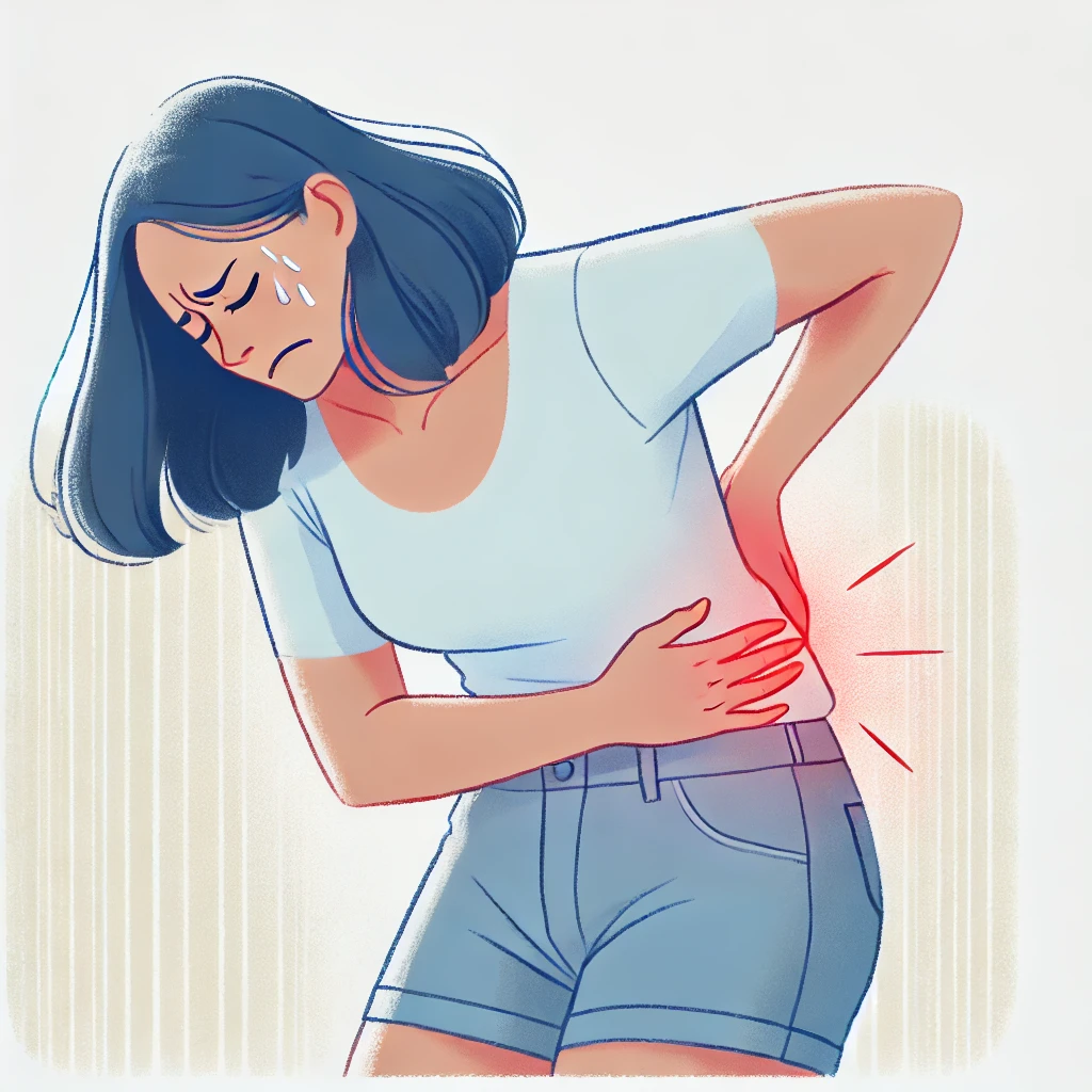 DALL·E 2024-09-03 15.11.50 – An illustration of a woman in her 40s experiencing sciatica pain. She is depicted holding her lower back and grimacing in discomfort, with a slight le