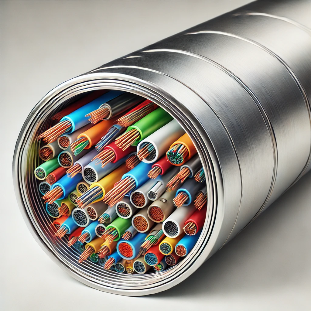 DALL·E 2024-09-05 11.17.36 – An illustration of a metallic pipe filled with multiple electrical wires inside, with no wires around the outside. The pipe is clean and smooth on the