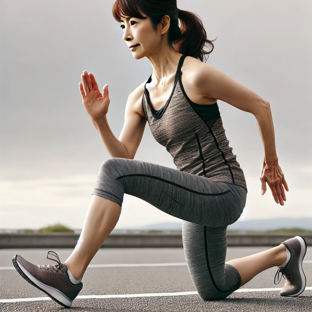 DALL·E 2024-09-16 16.27.18 – A Japanese middle-aged woman demonstrating proper running form. Her foot is landing directly under her body, with a slightly forward-leaning posture. - 倉敷市藤戸町の完全予約制整骨院〝天城整骨院〟です。
