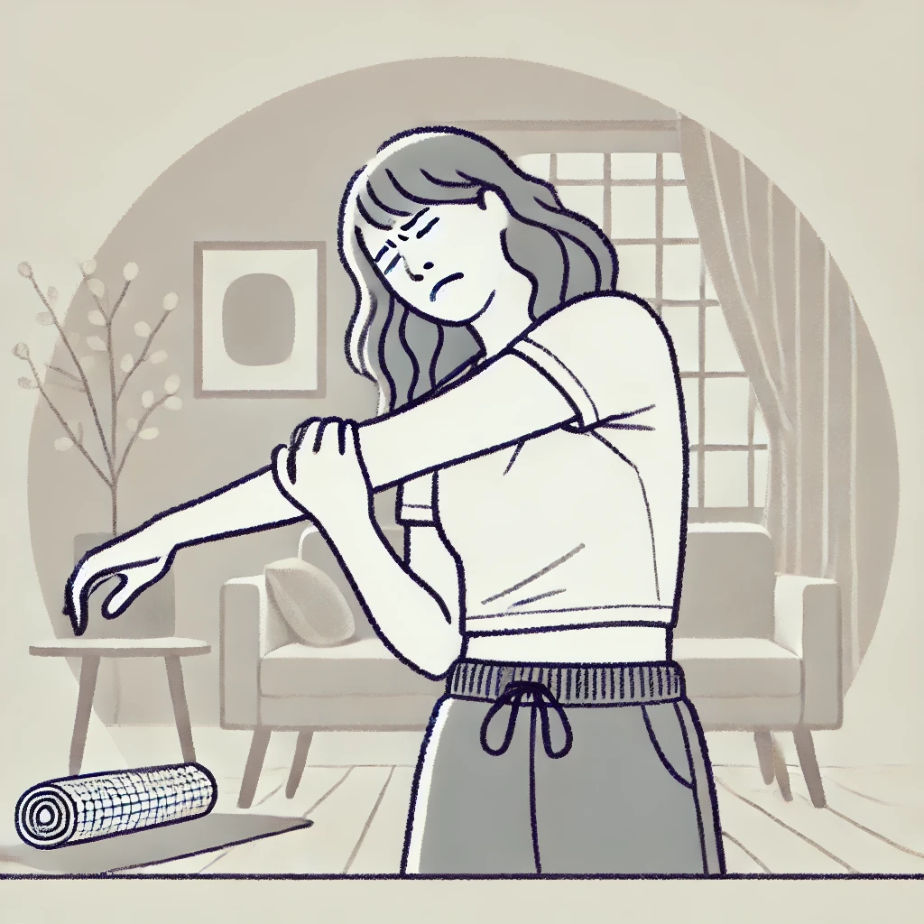 DALL·E 2024-11-18 18.15.12 – An illustration of a woman stretching with a pained expression on her face. She is in a minimal and cozy interior space, wearing casual workout clothe