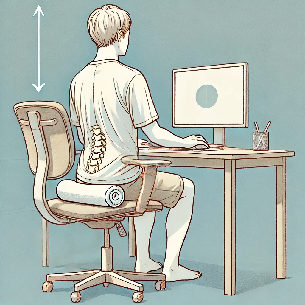 DALL·E 2024-11-19 11.08.40 – An illustration showing a proper sitting posture for desk work, designed in a gentle and clean style. The person is sitting deeply in a chair with the - 倉敷市藤戸町の完全予約制整骨院〝天城整骨院〟です。