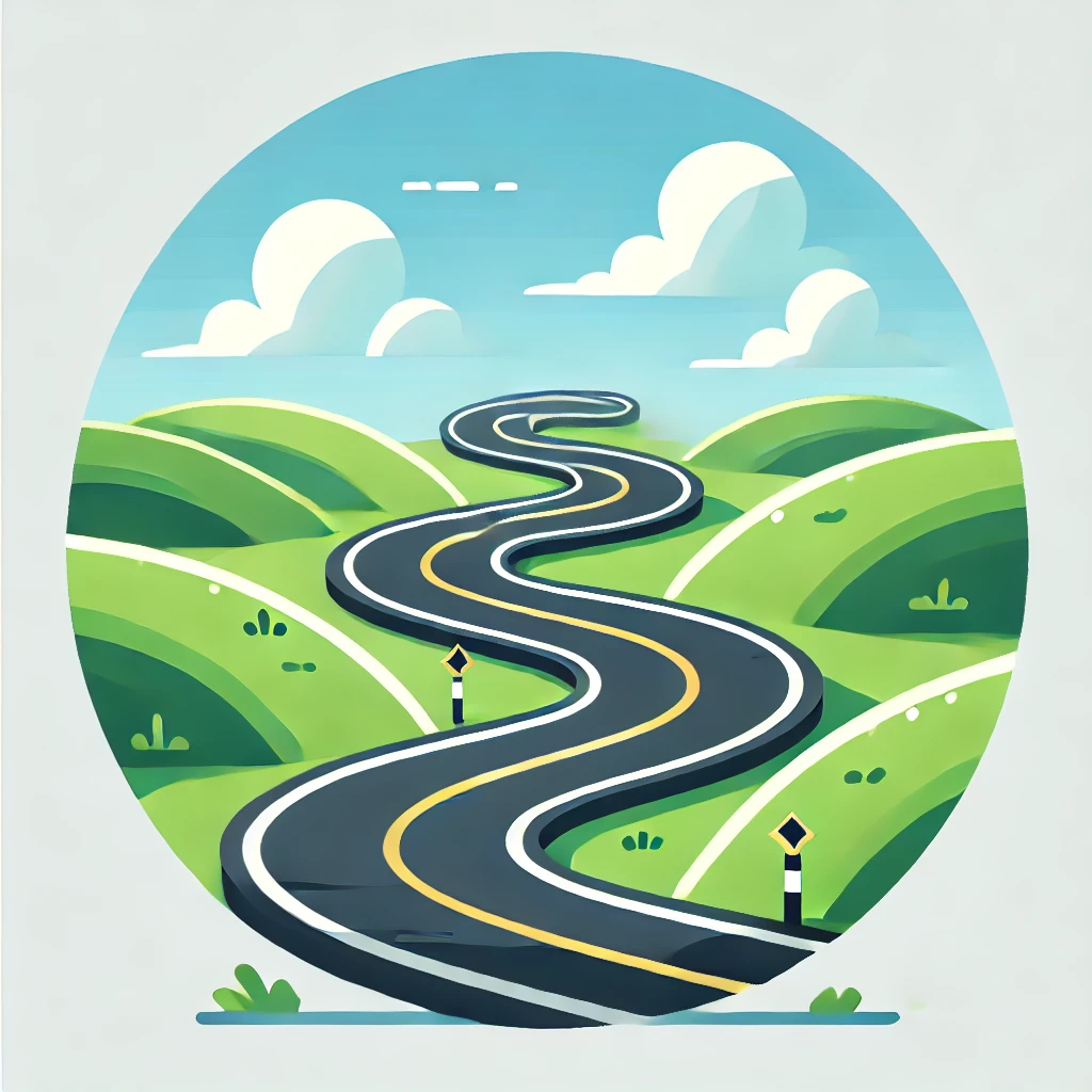 DALL·E 2024-11-21 05.19.19 – A simple and clean illustration of a winding road with multiple curves, surrounded by green grass fields and small hills on both sides, under a clear