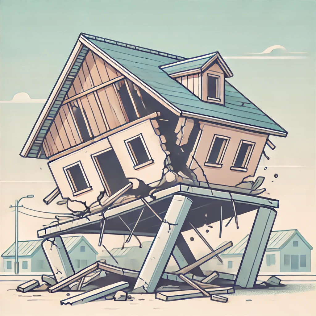 DALL·E 2024-11-23 16.13.51 – An illustration of a house structure on the verge of collapsing due to two support columns breaking and tilting. The two columns are visibly cracked a