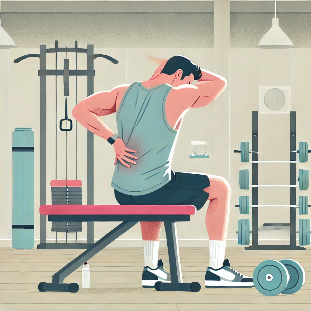 DALL·E 2024-11-27 04.07.43 – A detailed and clean flat-style illustration depicting a young man experiencing back pain after a workout. The scene shows him sitting on a gym bench,