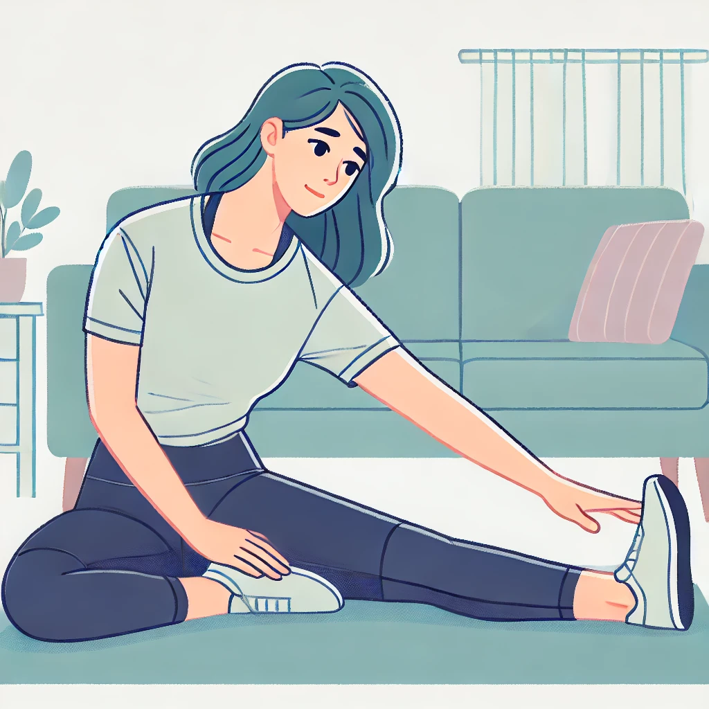 DALL·E 2024-12-19 22.06.37 – An illustration of a woman in her 30s to 40s with shoulder-length hair, performing a seated leg stretch. She is extending one leg forward and leaning
