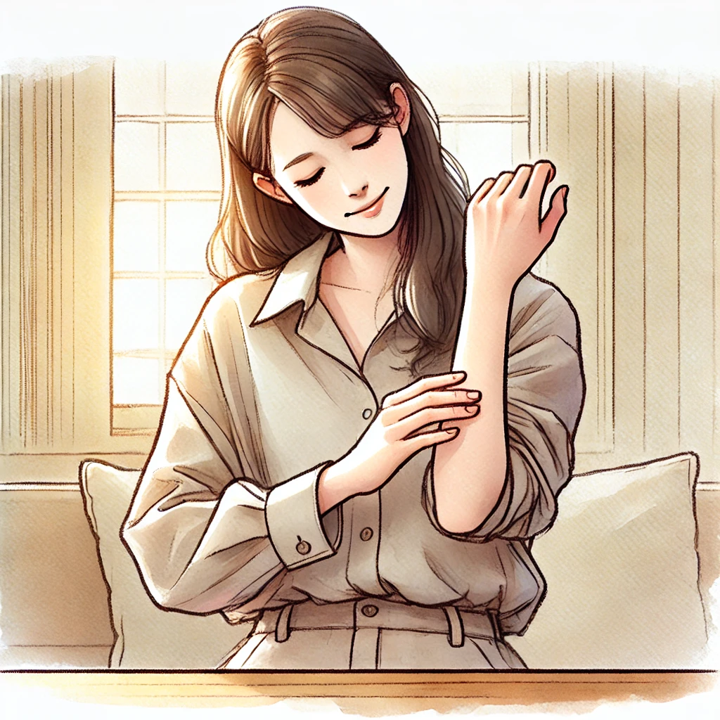 DALL·E 2024-12-25 18.30.08 – A woman in her late 20s gently massaging her forearm from elbow to wrist, with a relaxed expression. She is dressed in casual clothing, such as a comf - 倉敷市藤戸町の完全予約制整骨院〝天城整骨院〟です。