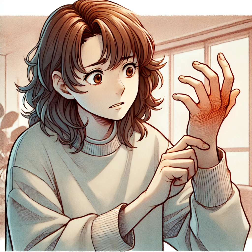 トップページ>ばね指>ばね指が悪化する原因!絶対にやってはいけない危険な習慣>DALL·E 2024-12-25 18.11.37 – A 40-year-old woman struggling with trigger finger, depicted with a painful and confused expression. She is looking at her right or left hand while tr