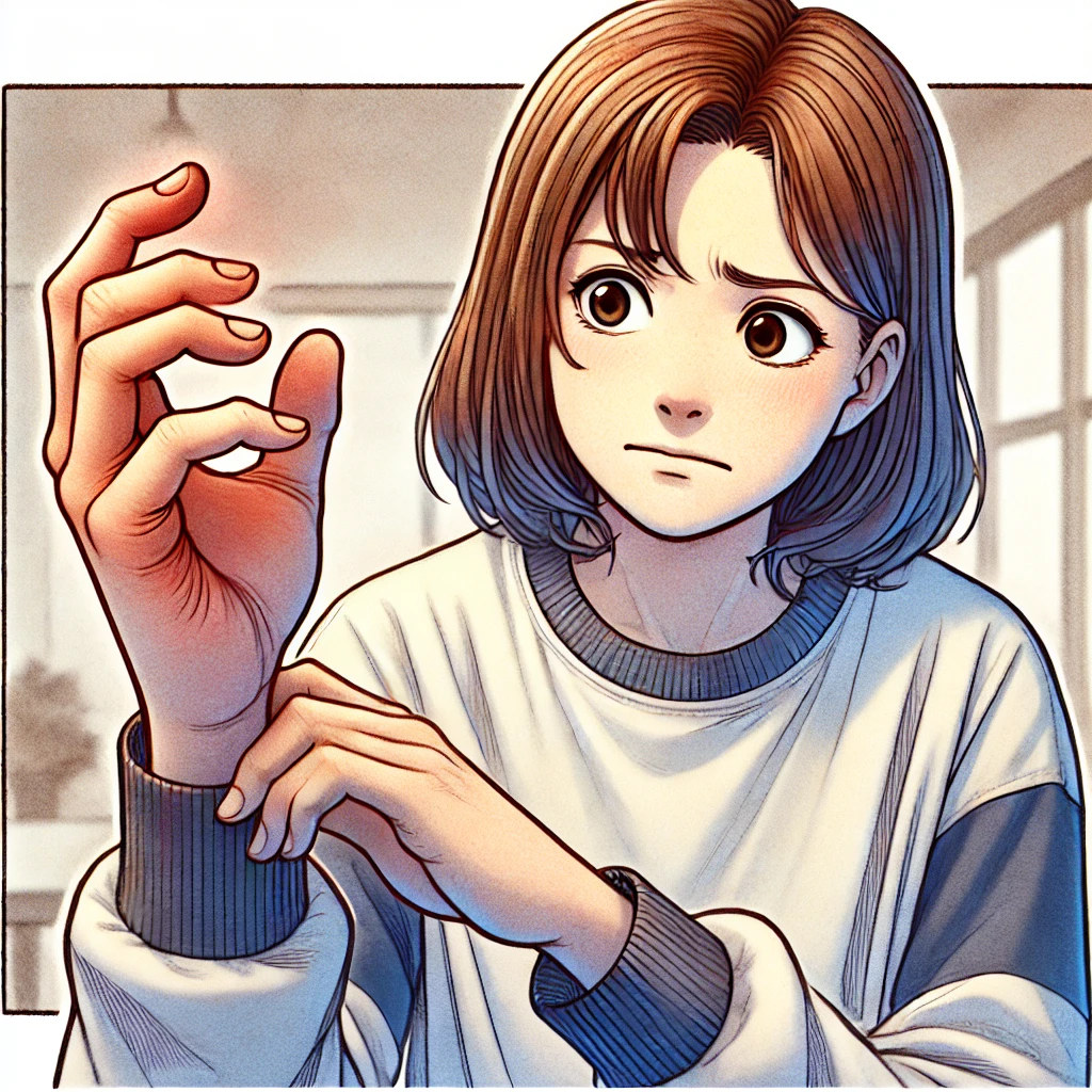 トップページ>ばね指>ばね指のつらさを解消!今すぐ試せる簡単ストレッチ>DALL·E 2024-12-25 18.11.41 – A 40-year-old woman struggling with trigger finger, depicted with a painful and confused expression. She is looking at her right or left hand while tr