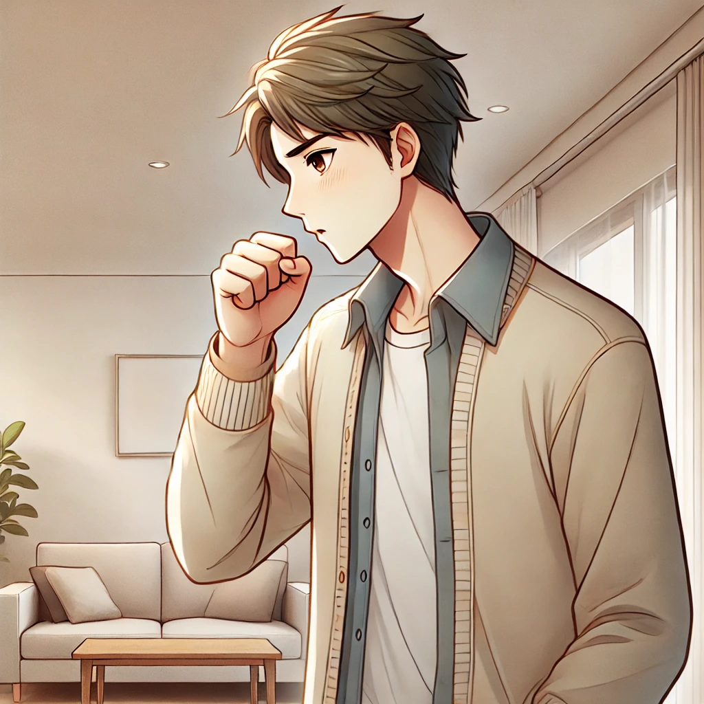 DALL·E 2024-12-29 10.01.30 – An anime-style illustration of a man in his 30s to 40s wearing casual clothing, depicted in the act of coughing. He is covering his mouth with one han - 倉敷市藤戸町の完全予約制整骨院〝天城整骨院〟です。