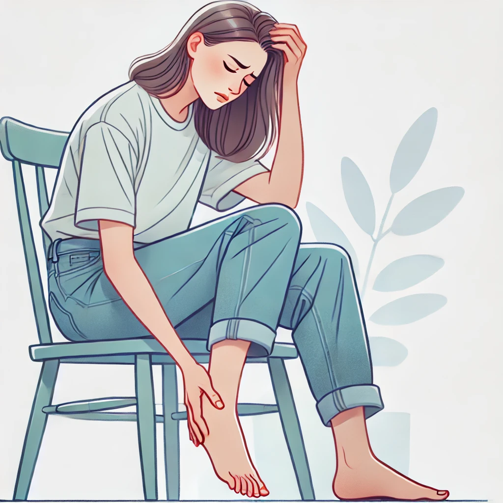 DALL·E 2025-01-01 16.43.09 – A digital illustration of a woman in her 20s or 30s, feeling pain in her foot. She is depicted with a distressed or uncomfortable facial expression, s