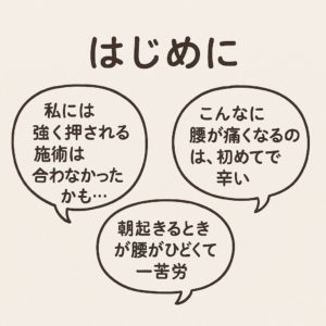 このような腰を強く押される整体施術を受けた後に腰痛になったり、腰痛の治療のために施術を受けたのに、余計に腰痛がひどくなるという方がおられます。