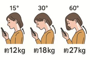 頭を前に傾ける角度によって首への負担は大きくなり、ストレートネックでは常に頸椎に大きな力がかかります。