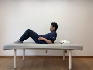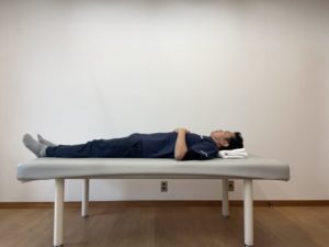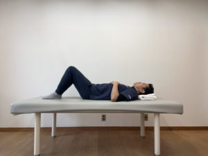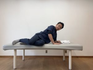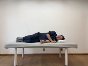 仰向けの状態から、膝を軽く曲げて身体ごと横向きになります。