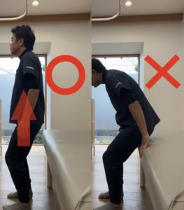 前かがみにあるのではなく、背筋を伸ばした姿勢で起き上がると腰に優しいです。